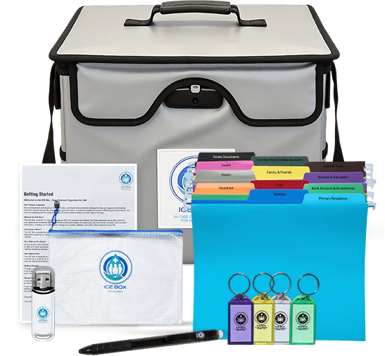 Each ICE Box system includes: 12 pre-labeled document folders, a 32GB USB flash drive for digital backups, a protective pouch for valuables, key tags, a combination lock, and a step-by-step setup guide created by estate experts.